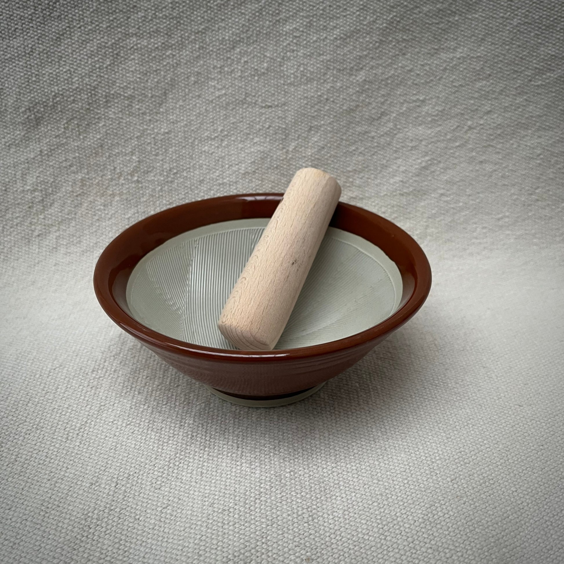 Mortel i japansk keramik med stöt (surikogi) av trä. Den räfflade botten gör den perfekt till att mala sesamfrön, kryddor, örter och grönsaker. Betydligt mer lättjobbad än den europeiska varianten.