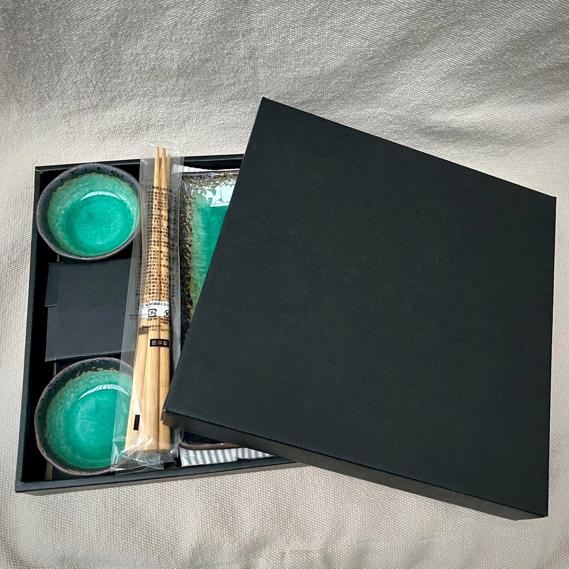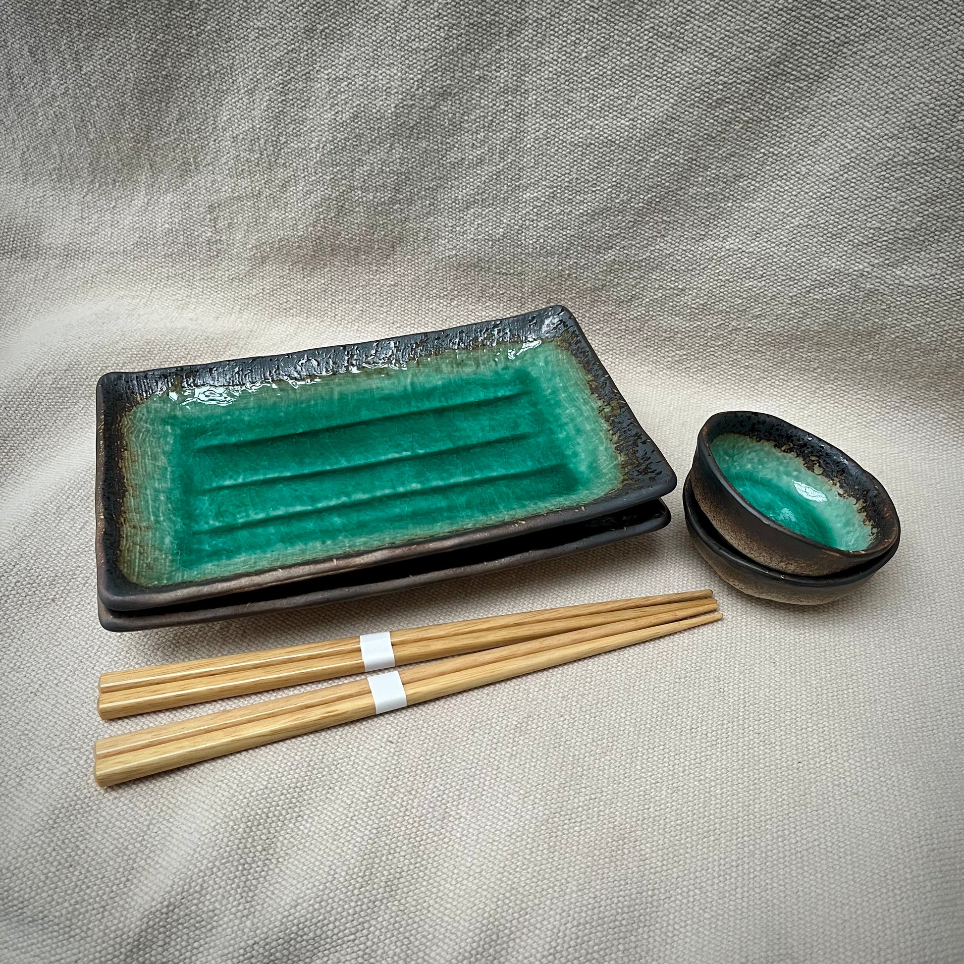 Innehåller två tallrikar, två dippskålar och två par ätpinnar.